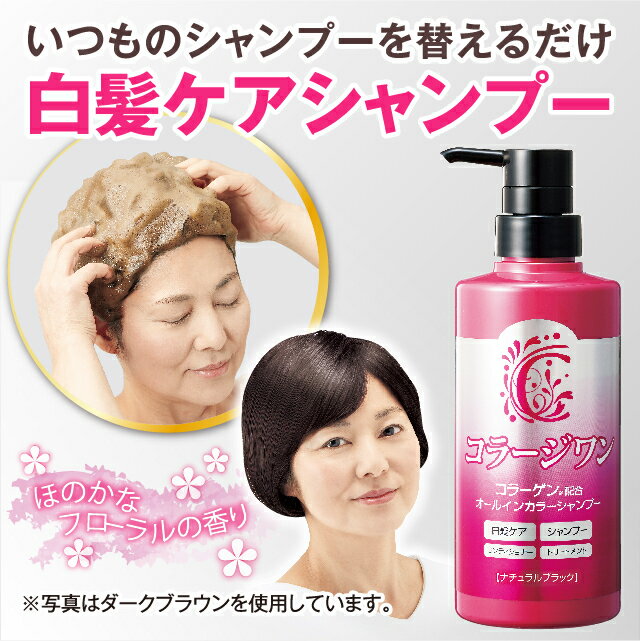 | ご使用方法 | 髪と頭皮全体を十分にすすいだ後、適量を塗布し、髪をやさしく洗ってください。その後、水に色がつかなくなるまで十分にすすいでください。 ○連続してご使用いただくことにより、徐々に白髪を目立たなくします。(髪への着色効果や色合いには個人差があります。) |