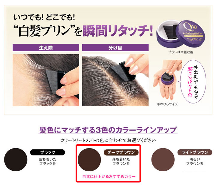 白髪は隠せても、「ごわつきやテカリが気になる…」「仕上がりが不自然で、かえって目立つ…」というこれまでの一般的な白髪かくしアイテムのイメージを一掃すべく、『DHC Q10クイック白髪かくし』は「さらさらフィニッシュパウダー」を配合しました。べたつかず、髪に自然になじみます。