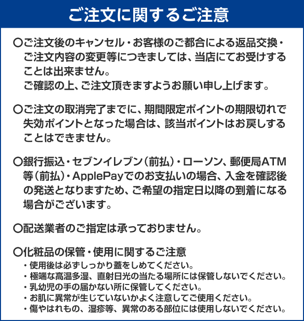 | ●お肌に異常が生じていないかよく注意してご使用ください。お肌に合わないとき、即ち次のような場合には、使用を中止してください。そのまま使用を続けますと、症状を悪化させることがありますので、皮膚科専門医等にご相談されることをおすすめします。 (1)使用中、赤み、はれ、かゆみ、刺激、色抜け(白斑等)や黒ずみ等の異常があらわれた場合 (2)使用したお肌に、直射日光があたって上記のような症状があらわれた場合 ●傷やはれもの、湿疹等、異常のある部位には使用しないでください。 |