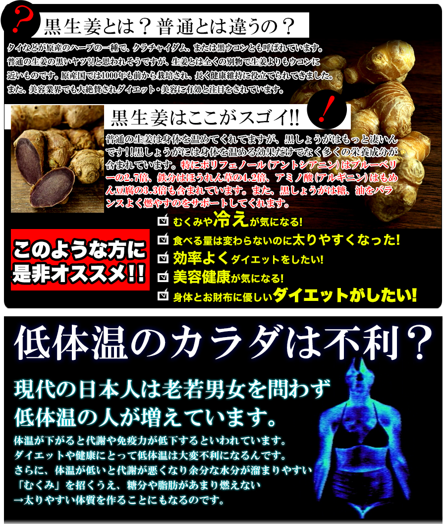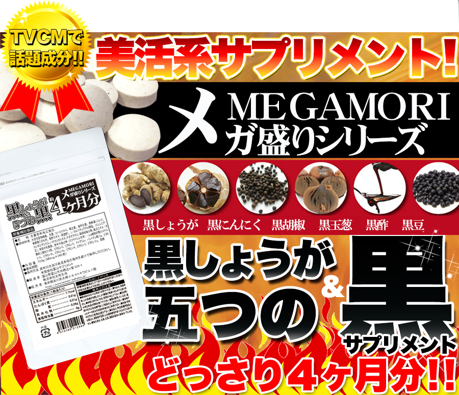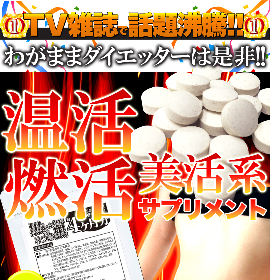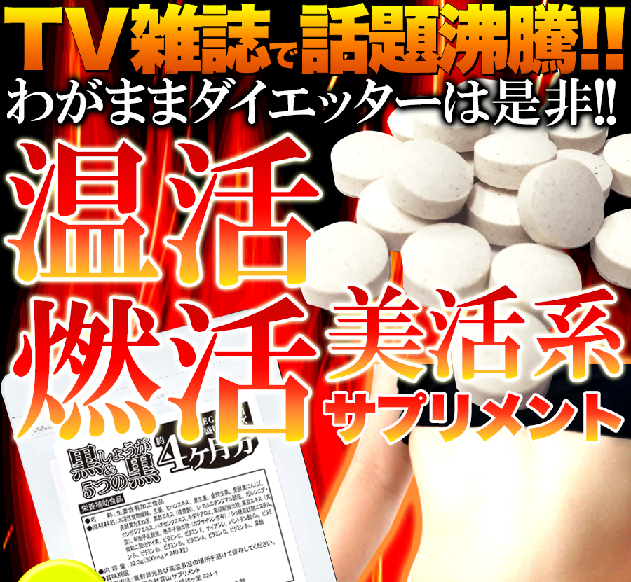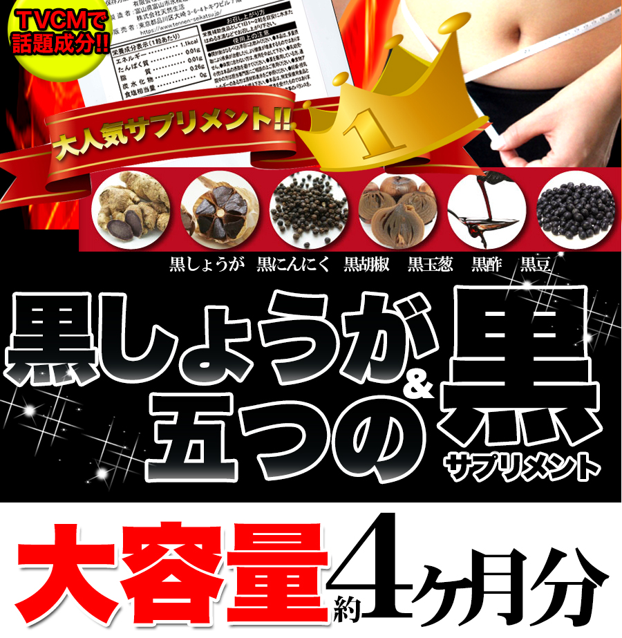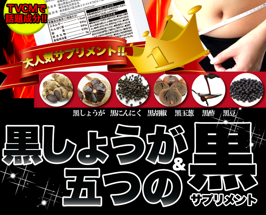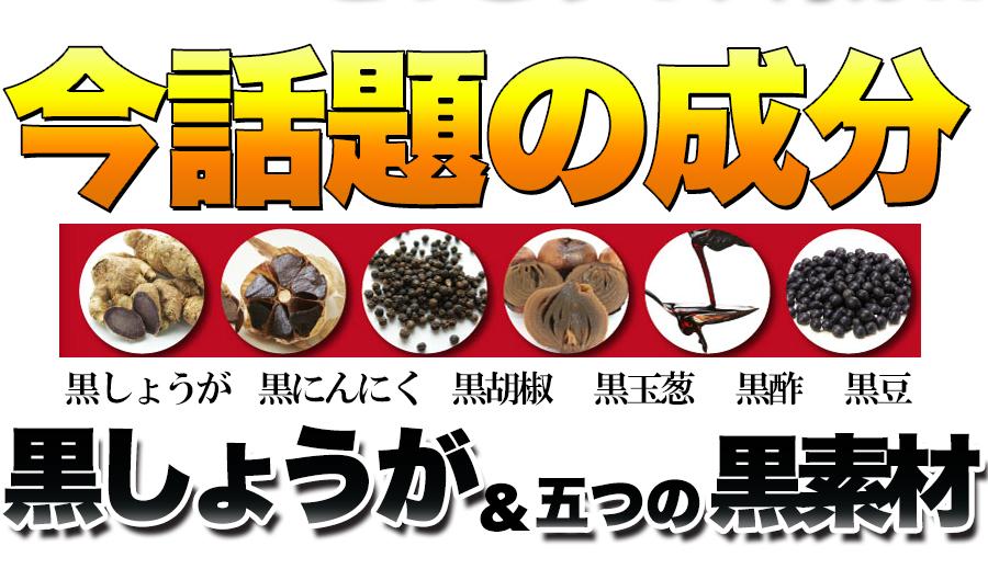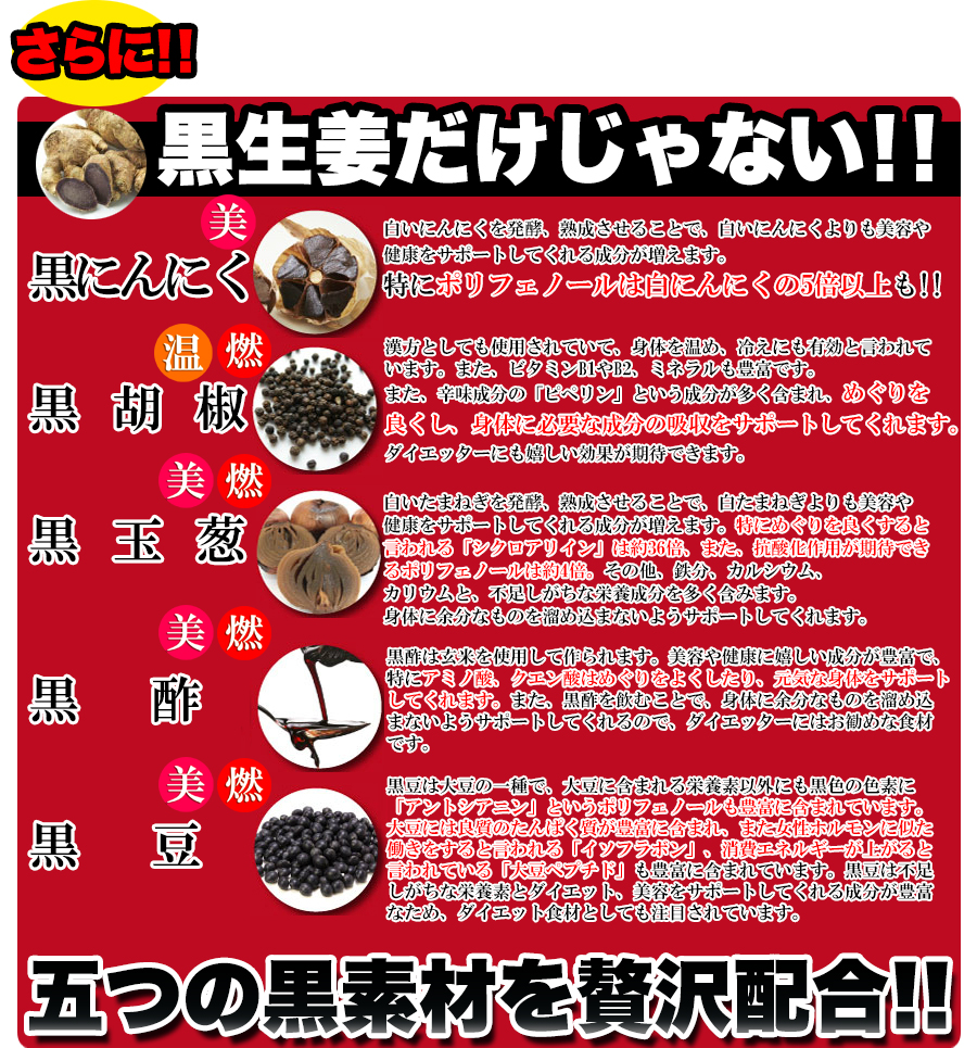 ■原材料名:水溶性食物繊維、生姜、ヒハツ抽出物、黒生姜、金時生姜、発酵黒にんにく、発酵黒たまねぎ、黒酢エキス(緑豊酢)、L-カルニチンフマル酸塩、ガルシニア・カンボジアエキス、ハネセンナエキス、キダチアロエ、黒胡椒抽出物、黒豆エキス(大豆)、有胞子乳酸菌、ショ糖脂肪酸エステル、微粒二酸化ケイ素、唐辛子抽出物(カプサイシン含有)、ビタミンC、ビタミンE、ナイアシン、パントテン酸Ca、ビタミンB1、ビタミンB2、ビタミンB6、ビタミンA、ビタミンD、ビタミンB12、葉酸