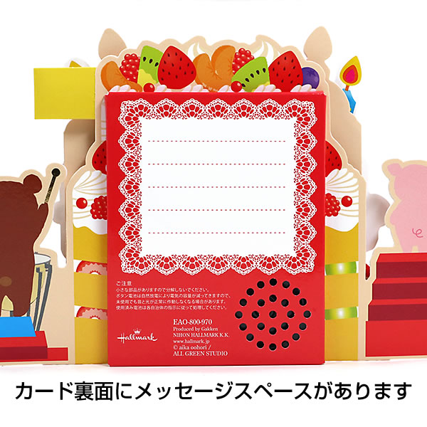 ◇仕様:立体ライト付きミュージックカード ◇曲名:♪「HAPPY BIRTHDAY」+「おめでとう!」の声と拍手 ◇カード裏面にメッセージスペースがあります ◇アルカリボタン電池使用 |