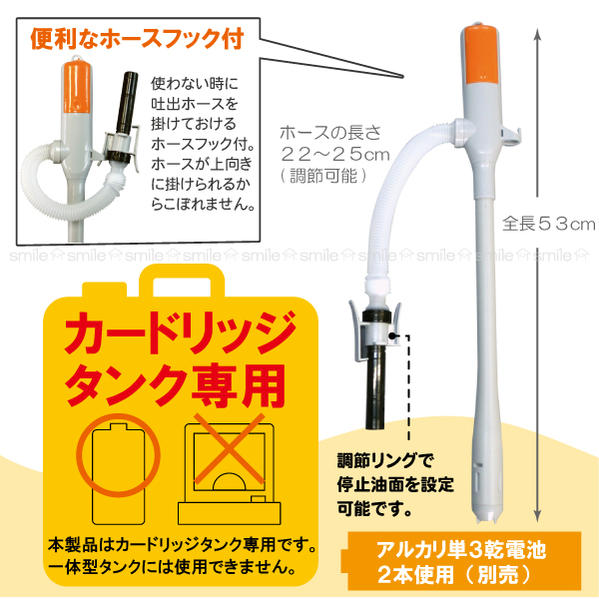| 光センサーで検知して、満タンで自動停止する灯油ポンプです。カートリッジ専用設計のため、ホースが短くなって無駄がないため給油がしやすく、残油も少なくなり、給油場所を汚しにくいようになっています。自動停止なので、もちろん灯油があふれる心配もありません。給油口先端のジャバラも角度が自在で使いやすいです。毎分約9Lの吸入・吐出量があり、スピーディーに給油ができます!ホースが短いので、使わない時の収納も便利です。 |